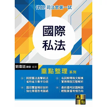準備「國際私法」考試,應先熟練傳統的重點;而新興學說或期刊,除時事考題外,建議最後再閱讀,以免落入猜題的輪迴。只有確實掌握傳統題型,在面對各種不同變化的考題,才能游刃有餘、迎面而解;且國際私法考點單純,只要熟讀本書,在國考上必得高分。作者就自己學習國際私法的經驗,在編寫本書時加強說理與舉例的連繫,希望讀者對於文字內容不懂時,尚能透過實例題來了解各家學說的奧妙,因此舉例盡量生動貼近時事,引起讀者共鳴。